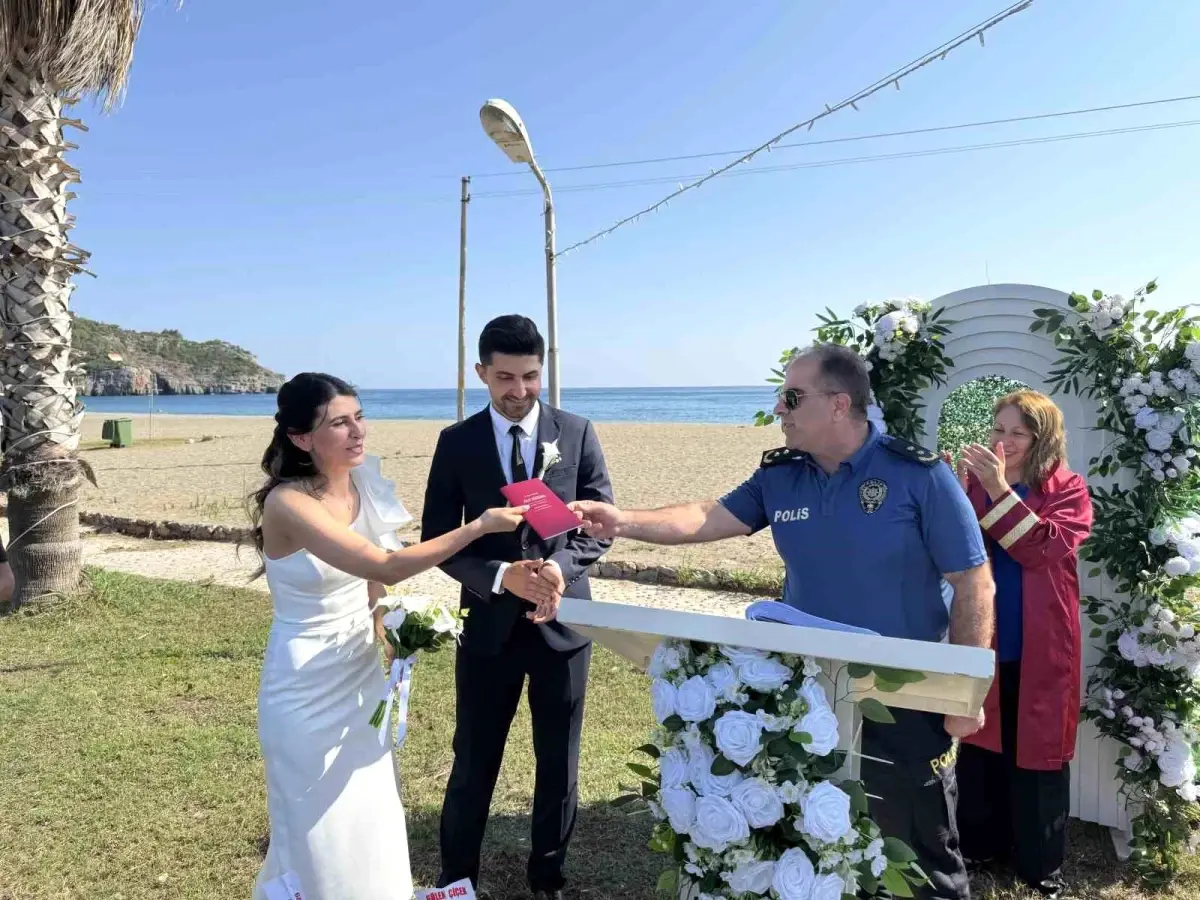Nikah memurunun kıydığı nikahın akabinde evlilik cüzdanı, İlçe Emniyet Müdürü Mehmet Ali Kayhan tarafından Dilek Çobanoğlu’na teslim edildi. – ANTALYA