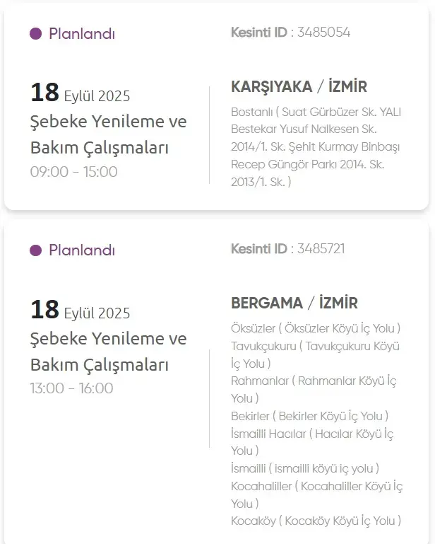 İzmir elektrik kesintisi ve GEDİZ elektrik kesintisi listesi araştırmaları yapılıyor. GDZ Elektrik Dağıtım şirketinden yapılan açıklamaya nazaran 18 Eylül günü İzmir’in çeşitli ilçelerinde farklı müddetlerde elektrik kesintileri yaşanacak. İşte İzmir’de elektrik kesintisi yaşanacak ilçeler ve İzmir’de elektrik kesintisi yaşanacak mahalleler! İzmir’de hangi ilçelerde elektrik kesilecek, İzmir’e elektrik ne vakit gelecek? İşte ayrıntılar haberimizde!